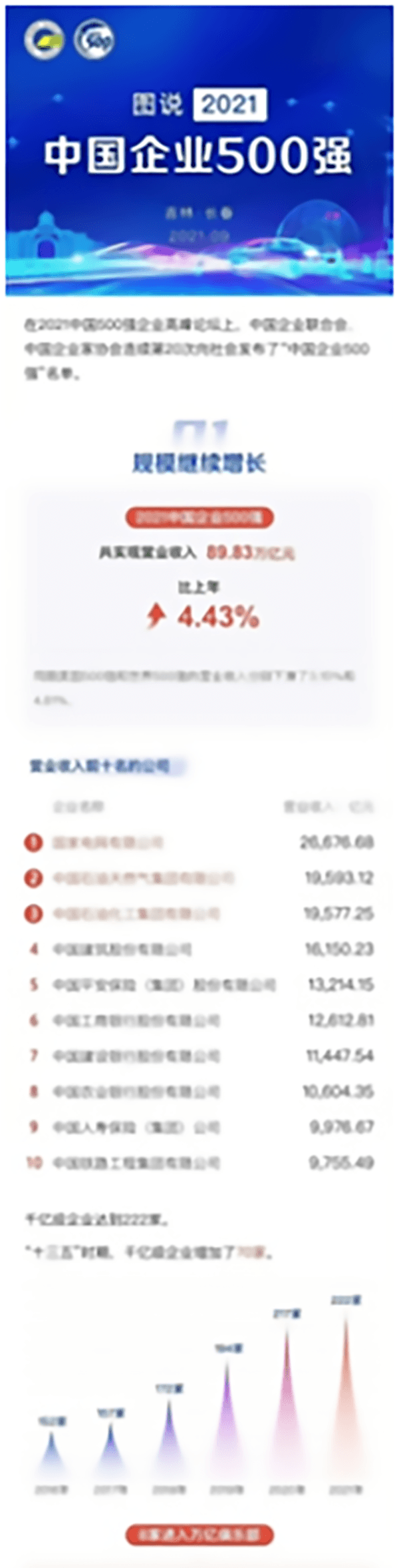 “千亿俱乐部”规模更大:“千亿俱乐部”企业数量增加5家,达到222家;万亿级企业保持在8家,分别是国家电网、中国石油、中国石化、中建集团、中国平安、中国工商银行、中国建设银行、中国农业银行。