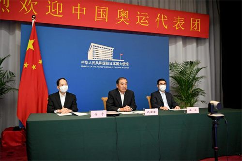7月22日,中国驻日本大使孔铉佑(中)与中国奥运代表团等视频连线。新华社记者 华义 摄